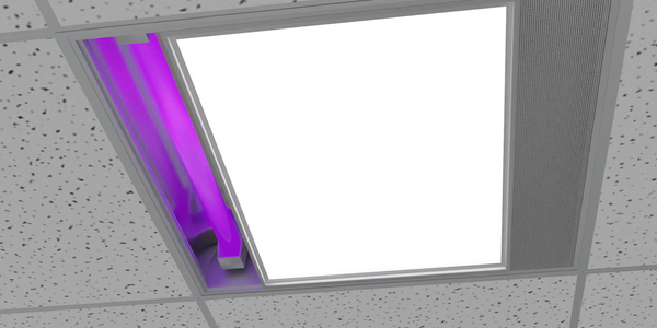 • Désinfection de l'air ambiant par ventilation forcée devant 2 tubes UV-C dans le coffrage,